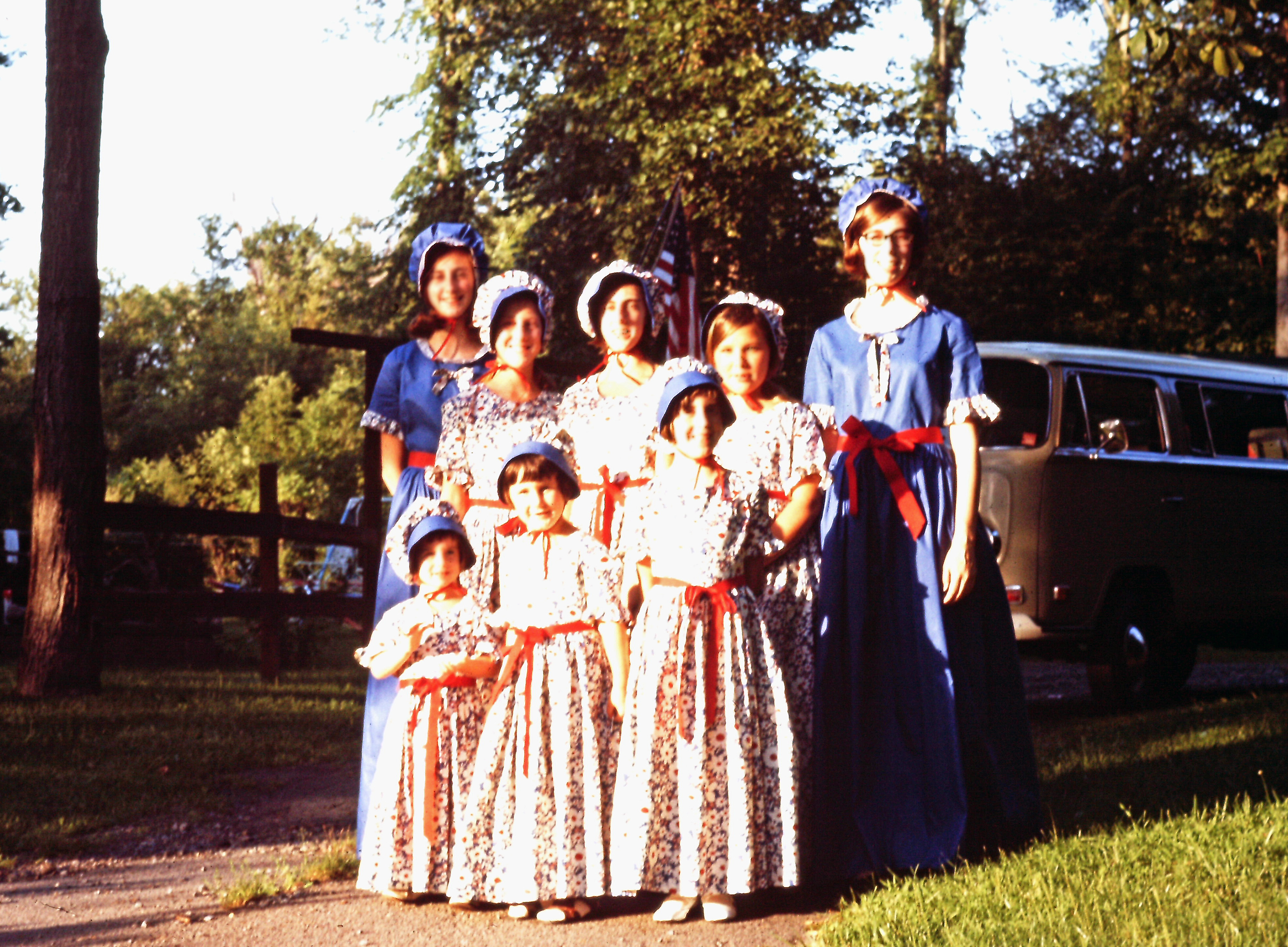 “Colonial” dresses and bonnets my mother sewed for us. I’m in the middle front, at approximately 4 years old, and our old Volkswagon van – the only vehicle available at the time that was large enough to hold the family – is in the background